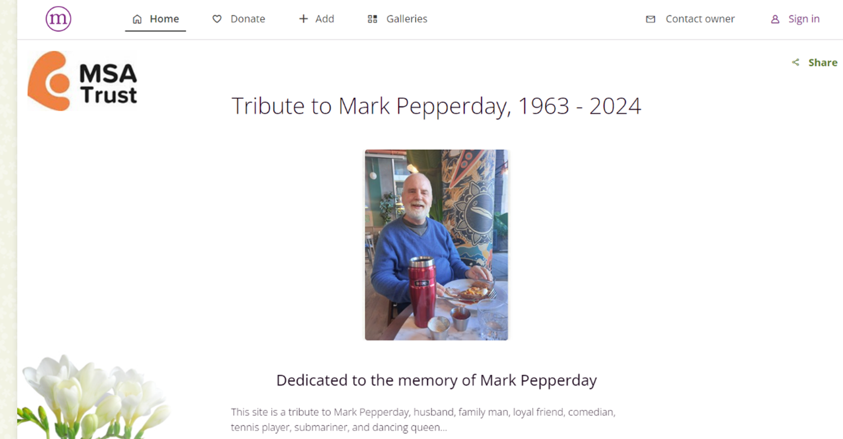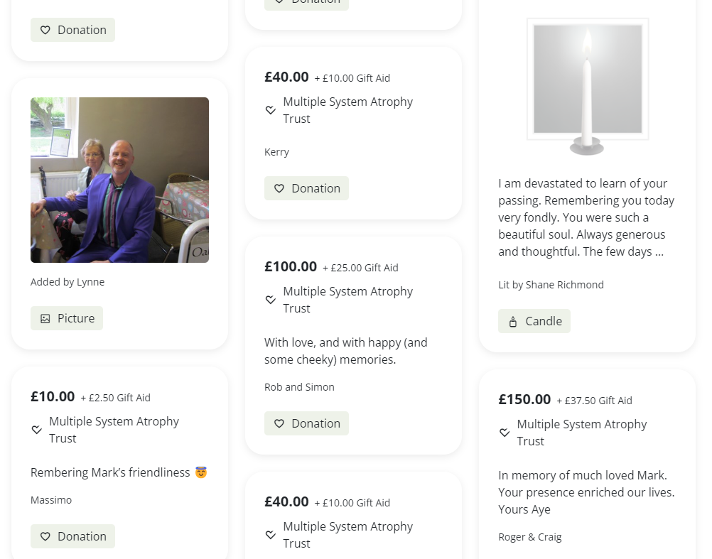 You can make the page a lasting tribute and an online remembrance space that celebrates the life of your loved one. Visitors can leave messages of hope, alongside a donation for MSA Trust, in memory of your loved one.
