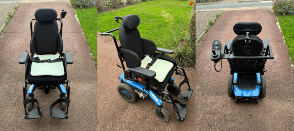 Originally priced at £1877.00.The chair is suitable for a person up to 5ft 9″ and 25 stone. The frame is under warranty for 25 years and the dual motor has a warranty of 5 years. Dual motor means independent use of foot and back positions. There is also an unused pressure sore relief seat pad and numerous optional back seat cushions to assist with full support and comfort